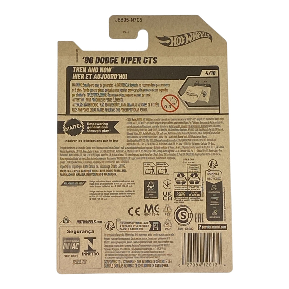 Speed into your collection with the yellow Hot Wheels '96 Dodge Viper GTS from the Then and Now Series 4/10! This 1:64 scale die-cast model captures the iconic '96 Dodge Viper GTS in a vibrant yellow finish, blending retro style with modern flair. Perfect for collectors and kids, its sleek design, detailed craftsmanship, and durable build make it ideal for high-speed play or bold display. Celebrate the legacy of this legendary supercar with a standout from the Then and Now Series. Grab the '96 Dodge Viper GTS today and rev up your Hot Wheels passion!
